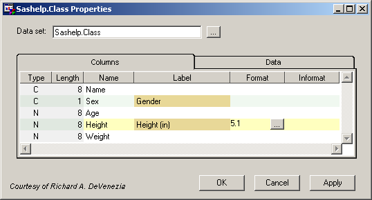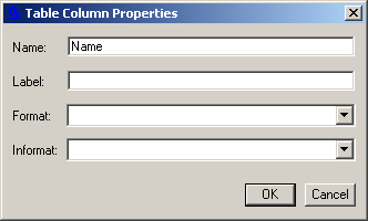 The column editor presented in the column tab is reminiscent of the SAS Version 6 VAR window. All the columns are shown, and any number of their properties may be edited simultaneously in the resizeable dialog window. A data tab is provided to allow a quick check of the effects of any changes applied.